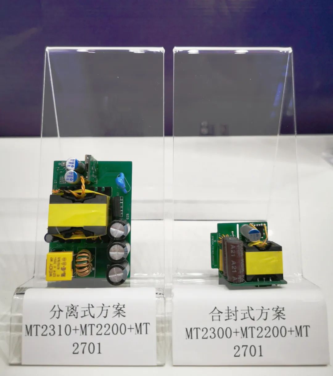 有線快充則帶來了20W-65W的整體解決方案,該方案分為分離和合封兩種,分離式方案可以讓客戶自由選擇合適的器件,最大化地發揮其自身Si MOS或GaN功率管供應鏈優勢;而合封式方案,則有利于產品的小型化。
