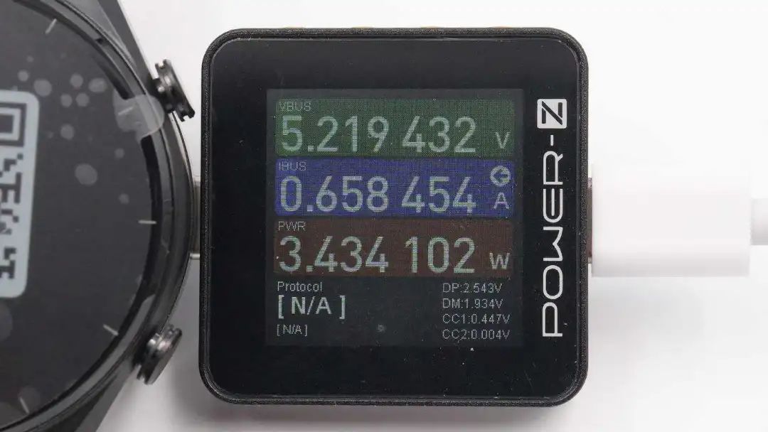 手表內(nèi)置470mAh 超大容量電池,續(xù)航可達(dá)12天,出差一周都不用充電,可以降低外帶成本,和商務(wù)人士絕配。使用包裝自帶的無線充電底座給手機(jī)進(jìn)行無線充電,通過ChargerLAB POWER-Z KM002C測(cè)得輸入功率為5.22V 0.66A 3.43W。