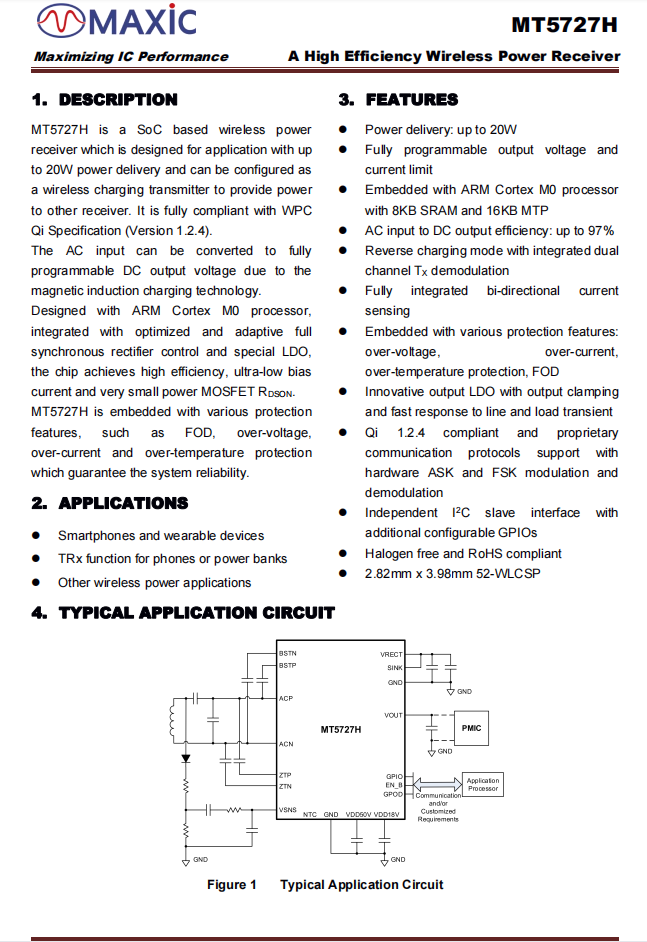 MT5727H內(nèi)置ARM M0處理器,搭配8KB SRAM和16KB MTP存儲(chǔ)器,支持私有無線充電協(xié)議,芯片內(nèi)部集成同步整流器和LDO,芯片內(nèi)置過壓過流保護(hù),支持I2C接口和可配置的GPIO接口。