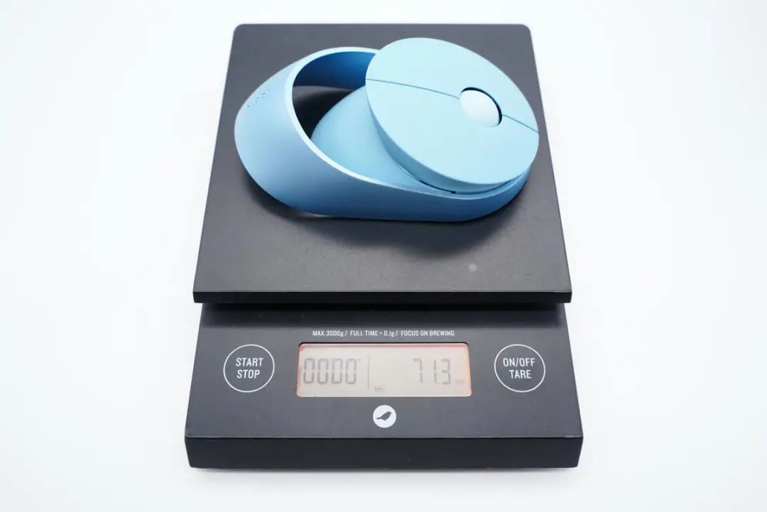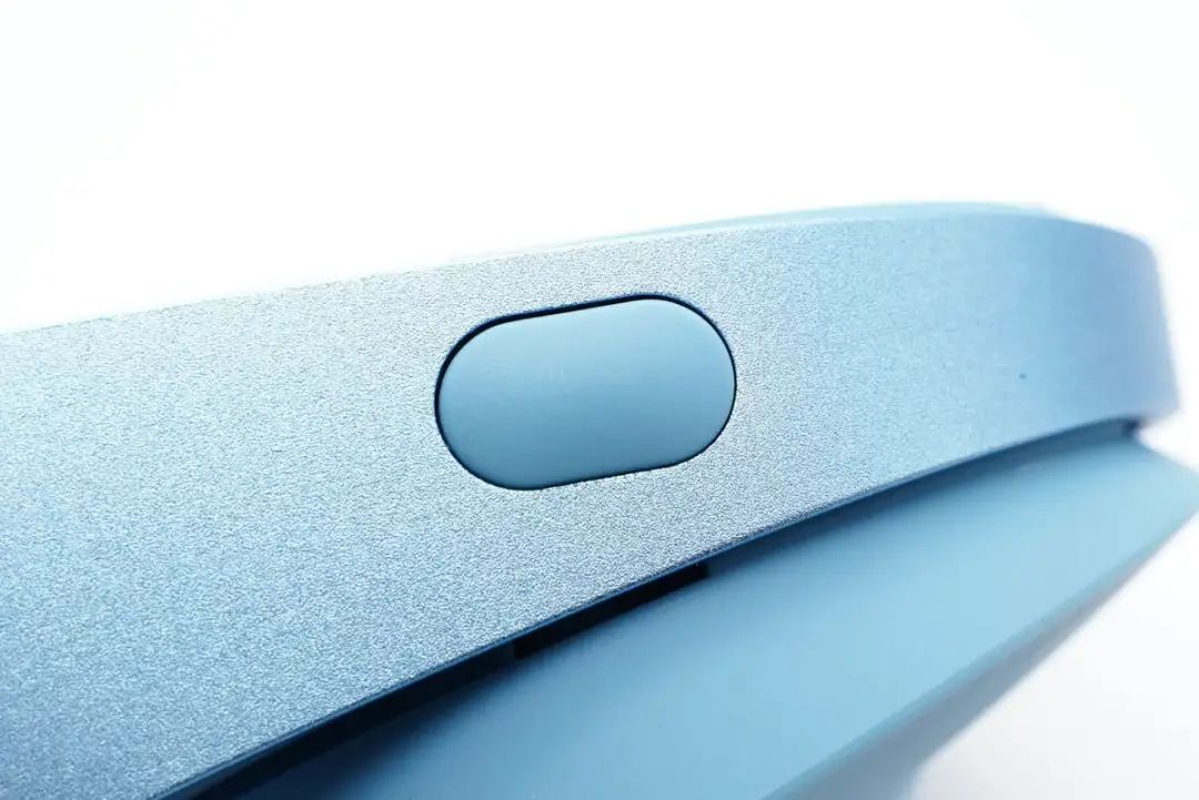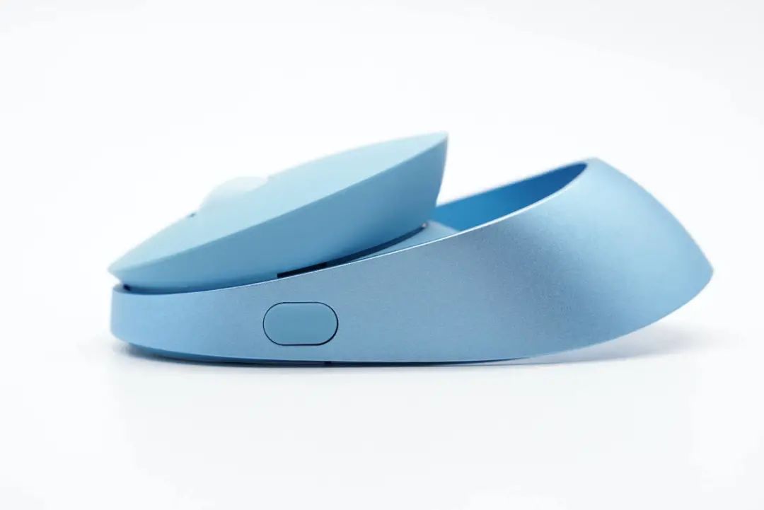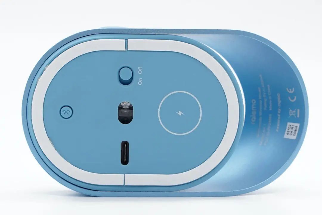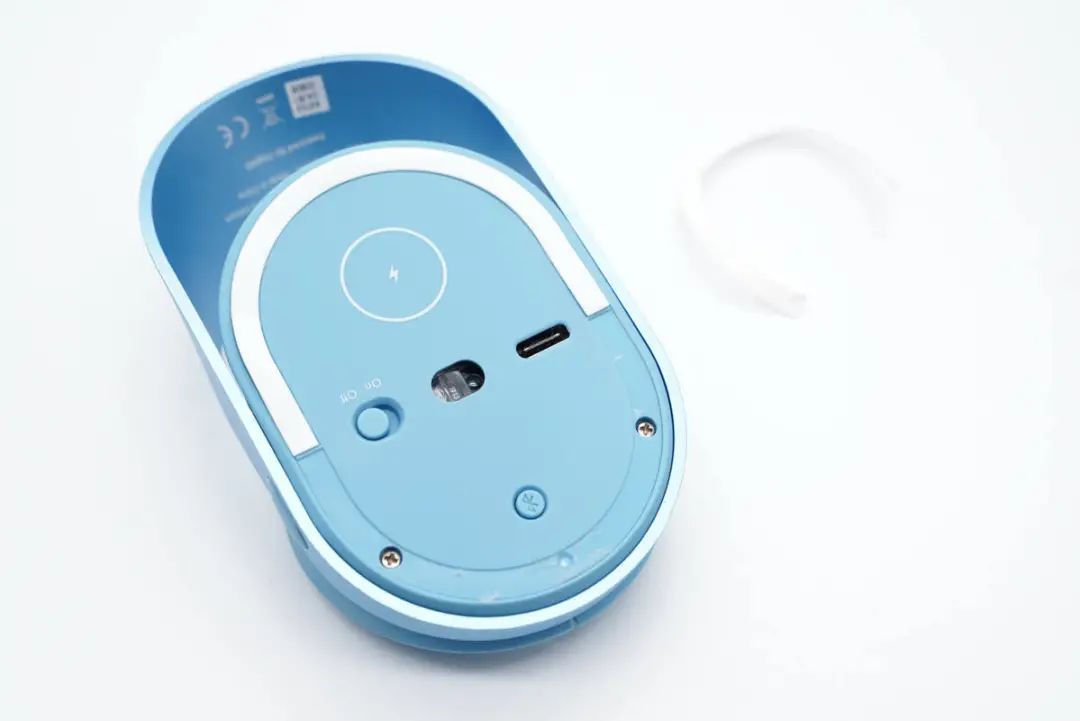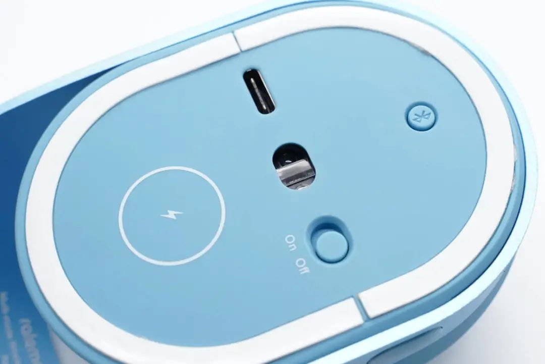 鼠標底部邊緣貼有白色聚四氟乙烯腳墊,兩端分別是藍牙鍵和無線充電標識,兩側是USB-C充電口和電源鍵。
