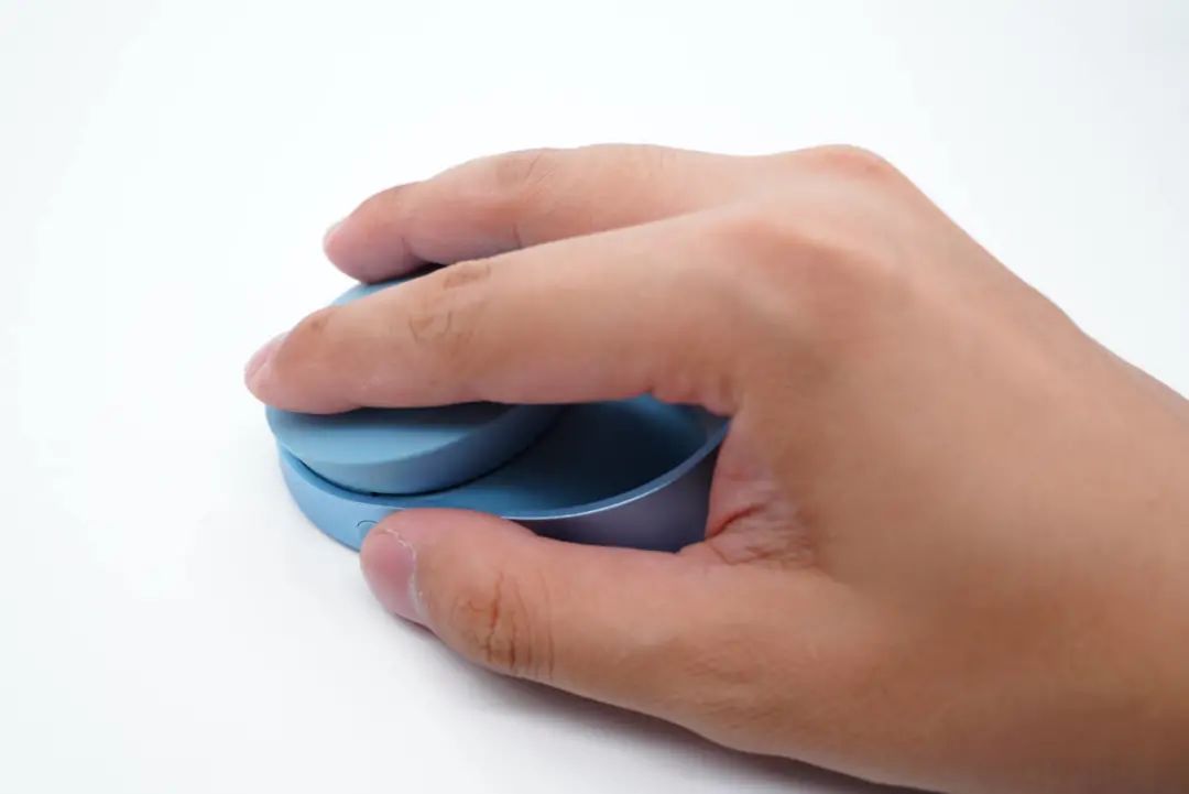 雷柏Ralemo Air 1無線鼠標整體小巧,機身中空造型設計新穎。頂部圓形塑料殼分半即為左右鍵,表面磨砂處理,球形滾輪位于中心稍微偏下位置。
