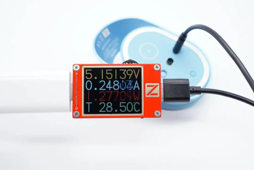 另外進行有線充電測試,使用KT002可以測得充電功率為5.15V 0.25A 1.28W。