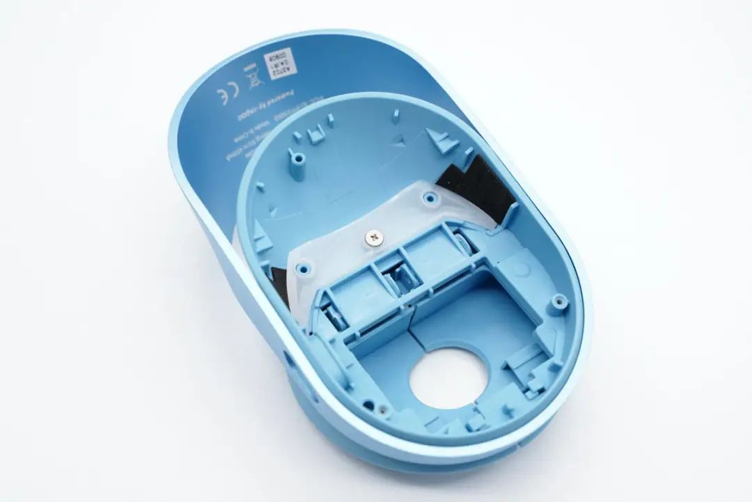 將鼠標底部白色腳墊撕下,底部外殼使用螺絲固定。