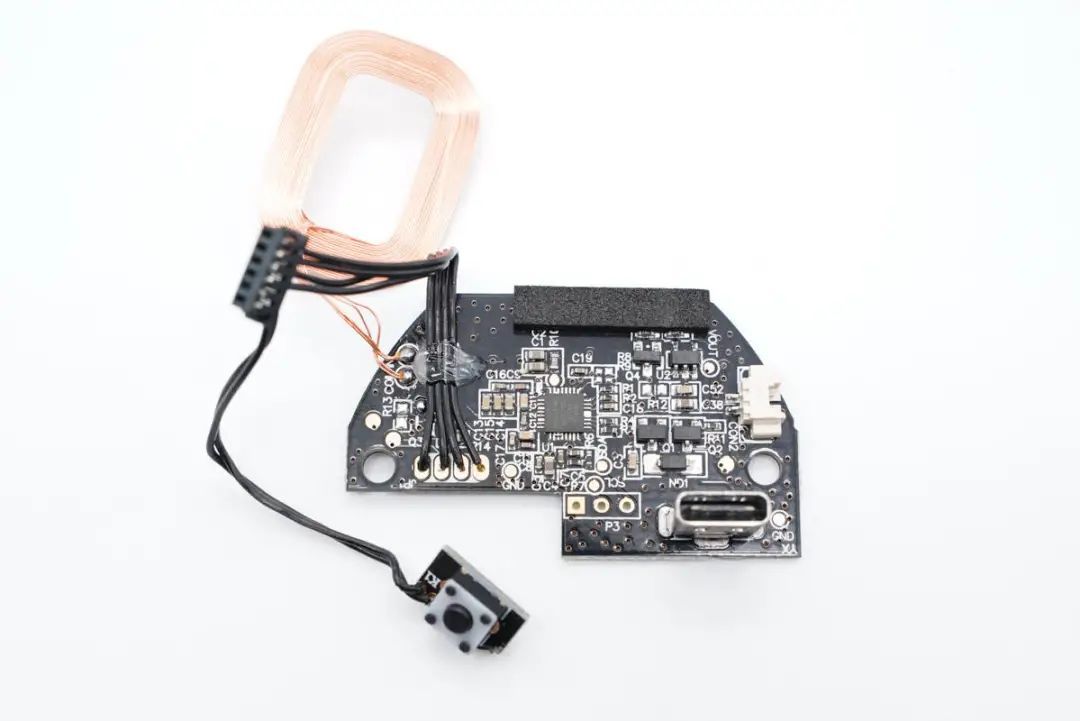 充電頭網通過拆解發現,鼠標內部設有充電和控制兩塊PCB板,PCB板之間以及和電芯均采用導線插拔式連接,組裝方便。充電小板上設有USB-C和無線充電接收線圈兩者充電方式,其中無線充電路采用美芯晟MT5705無線充電接收芯片,該芯片不僅轉換效果高,而且擁有完善的保護機制,符合最新WPC Qi規范,非常適合TWS耳機充電倉等各類小功率智能設備。