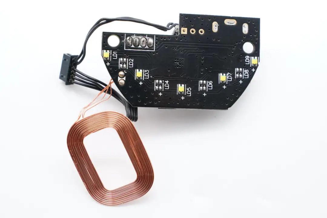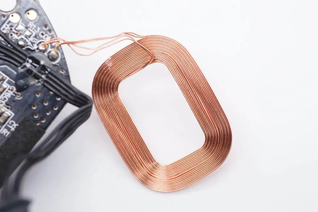 無線充電接收線圈特寫,漆包線繞制,隔磁片粘貼在電池上。