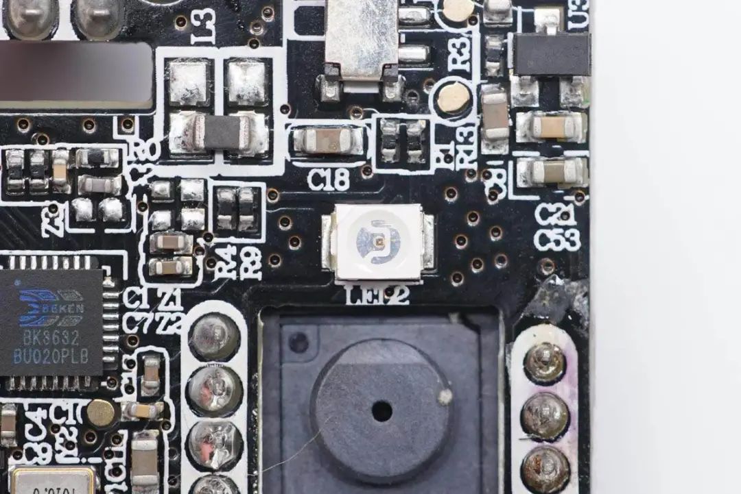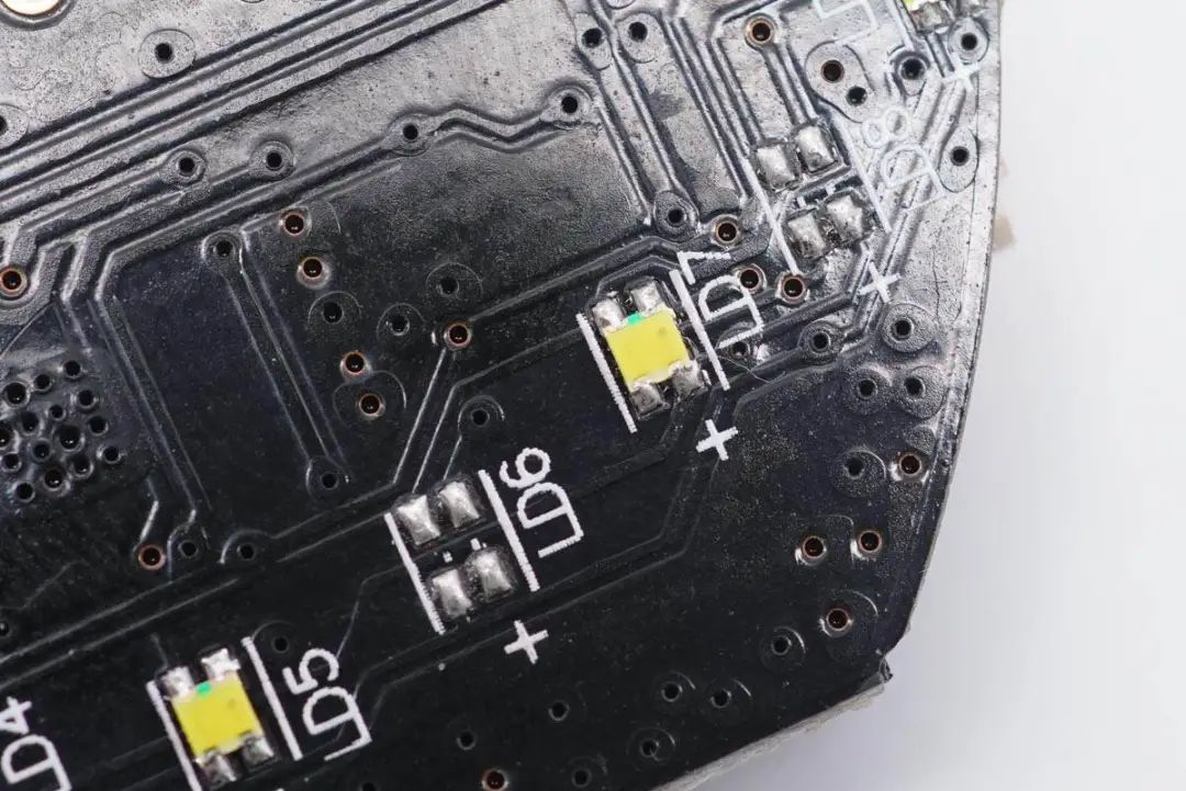 發光二極管特寫,下方的光電感應器底部中心設有小孔。