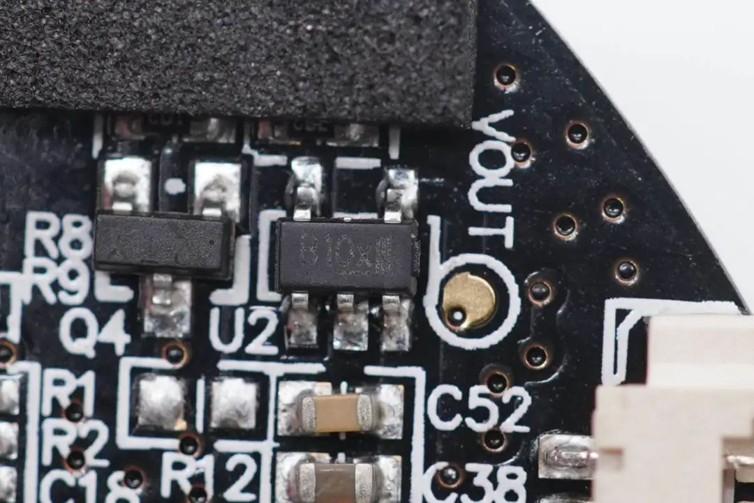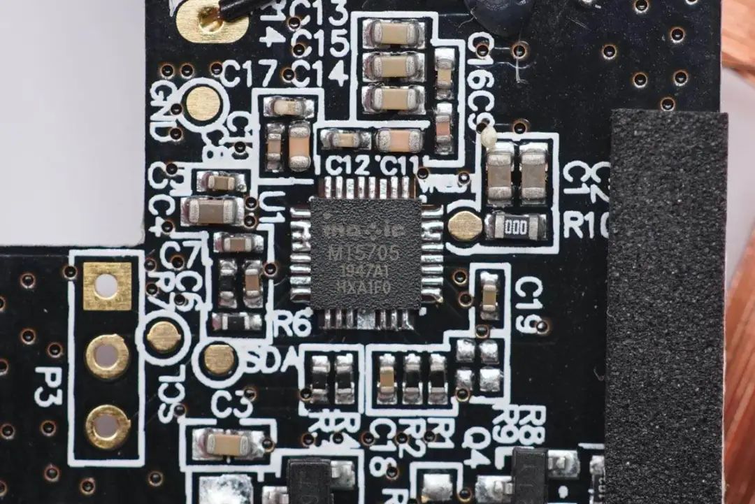 無線充電接收芯片采用美芯晟MT5705,上方三顆諧振電容并聯。MT5705是一款基于磁感應的無線充電接收器的SoC(片上系統),采用嵌入式ARM Cortex M0處理器,2KB SRAM, 8KB OTP,完全符合BPP的最新WPC Qi規范(版本1.2.4)。