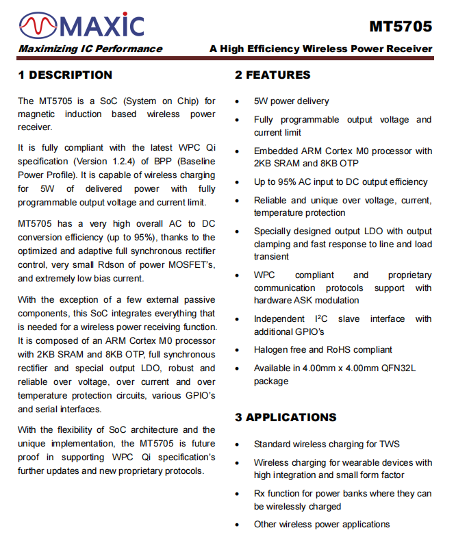 MT5705可提供穩定的5W輸出功率,支持輸出電壓5V和電流最大1A,AC to DC轉換效率達95%;其擁有完善的過壓、過流、過溫保護機制,獨立的I2C通信接口和豐富的GPIO。封裝為4.00mm x 4.00mm QFN32L,尤其適合TWS耳機充電倉等各類小功率智能設備。