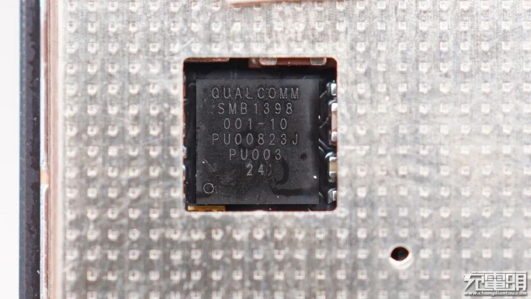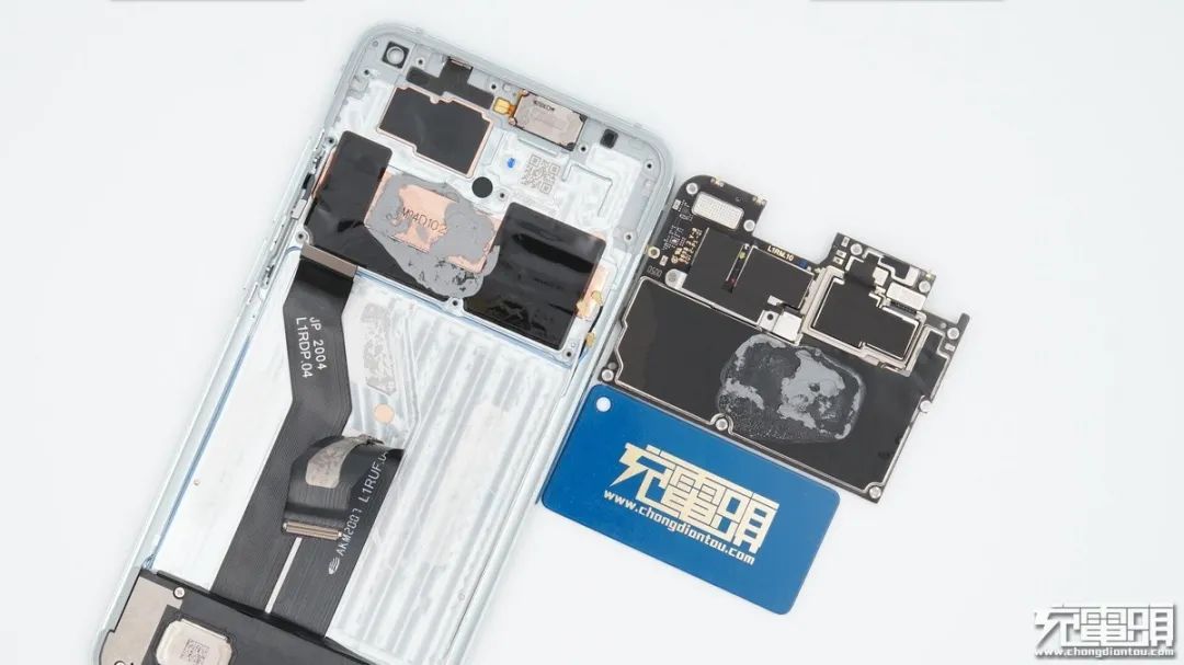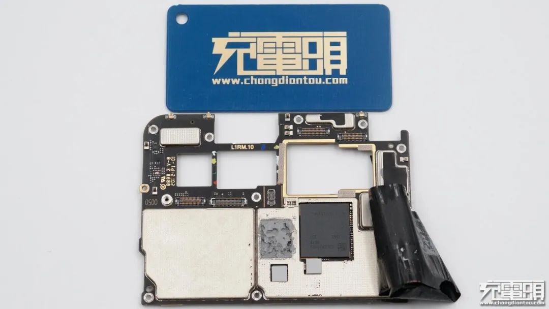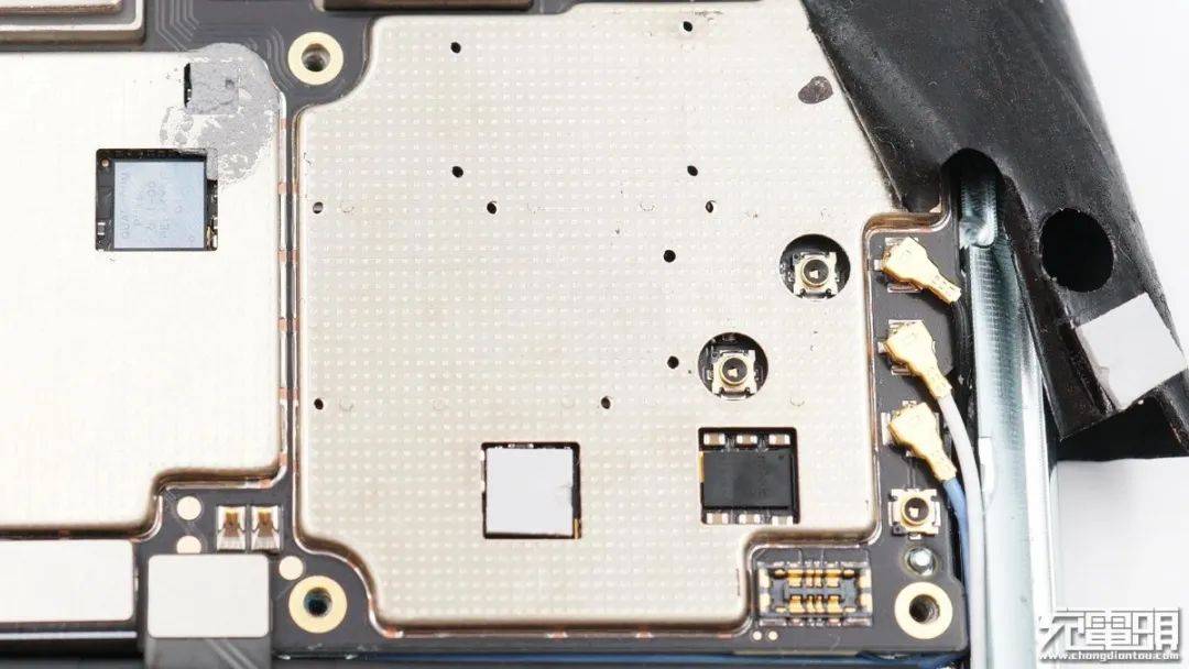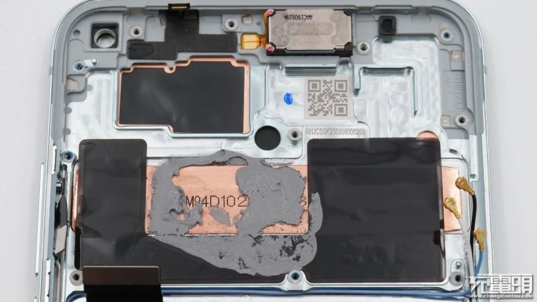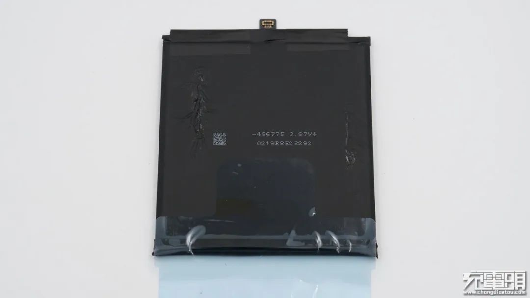 電池和主板之間為插座可拆卸設計,組裝方便,也方便后面對電池進行更換等服務,同時電池保護板背面與鋁合金中框之間還有一條導熱硅膠,在高速充電時可為保護板散熱,降低溫升。
