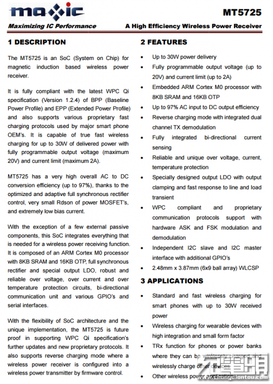 無線充接收芯片采用美芯晟MT5725。MT5725是一款基于磁感應的SoC高集成無線充電接收芯片,集成了無線充電接收功能所需的一切,可提供高達30W的輸出功率。并具有非常高的整體AC/DC轉換效率(高達97%)。