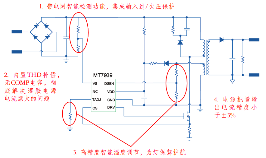 MT7939是一款無COMP電容、單級、高功率因數,QRM模式的隔離LED恒流驅動芯片,同時內置線電壓補償、輸入過壓/欠壓保護、THD補償及過溫調節引腳,過溫保護點可調的解決方案。