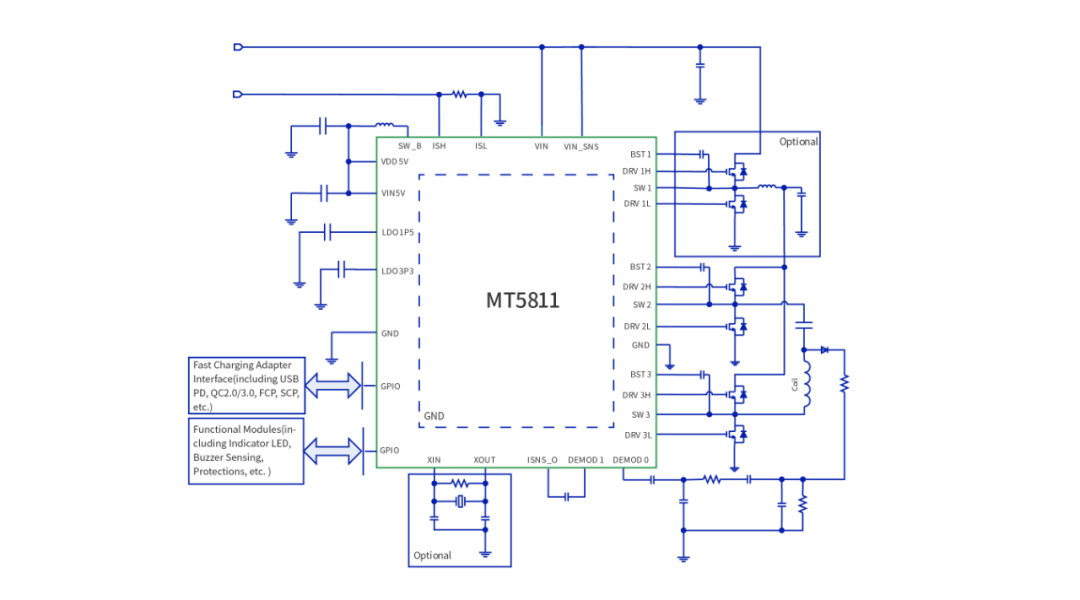 MT5811是一款集成USB PD、QC等快充協(xié)議、高度集成的符合WPC Qi最新標(biāo)準(zhǔn)的無線充電發(fā)射芯片,支持15W輸出功率。MT5811集成ARM M0 處理器,擁有卓越的高效率和緊湊設(shè)計(jì),提供強(qiáng)大、自主的二次開發(fā)空間。芯片內(nèi)部集成3對(duì)NMOS驅(qū)動(dòng)器,可用于單線圈應(yīng)用的無線充電器,支持定頻調(diào)壓控制,無需外置驅(qū)動(dòng)器。