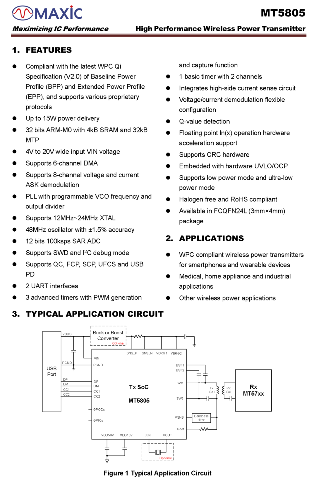 MT5805支持過壓保護、過流保護、欠壓保護和過熱保護,還內置了動態功率限制,支持動態降功率輸出。芯片采用FCQFN3*4-24L封裝,適用于手機及可穿戴設備的無線充電發射端,醫療設備,家用電器以及工業設備的無線充電應用。