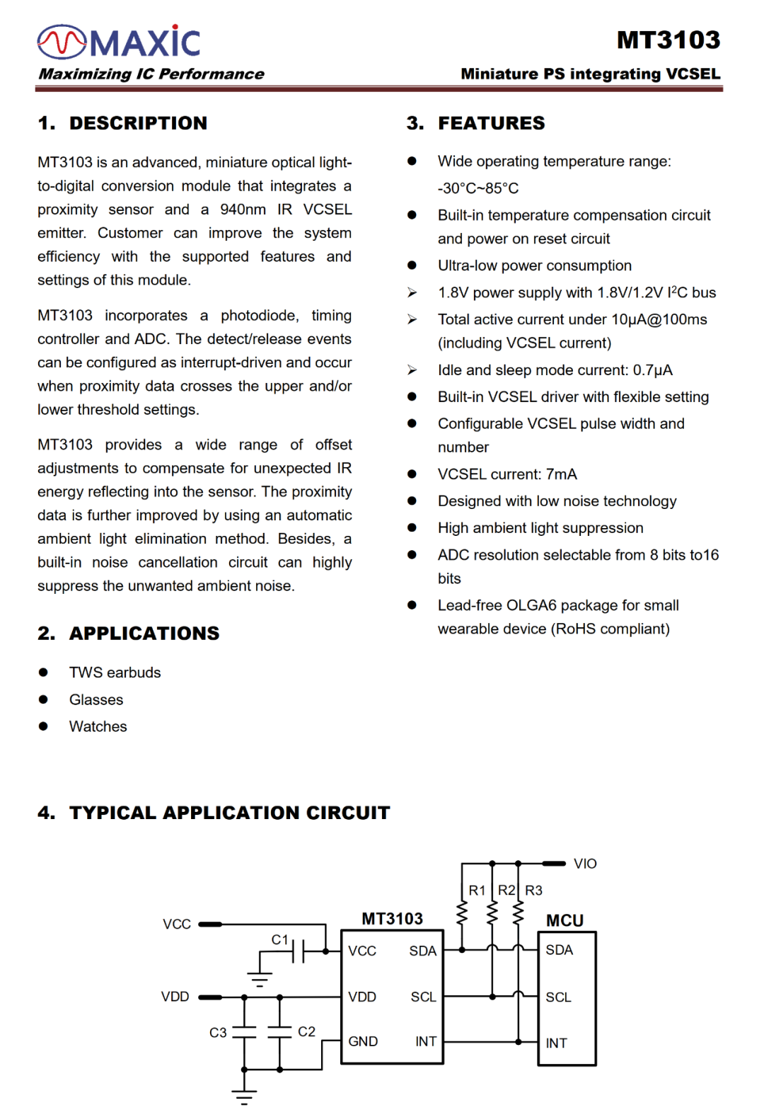 MT3103系列是一款小尺寸、超低功耗、高信噪比、集成940nm VCSEL的數字光學接近傳感器,待機功耗低至0.7uA,配有公司自研自適應底噪抑制算法,有效提升入耳檢測效率。主要應用于TWS/OWS等無線藍牙耳機、VR/AR智能眼鏡、智能手表、便攜式智能硬件產品等。