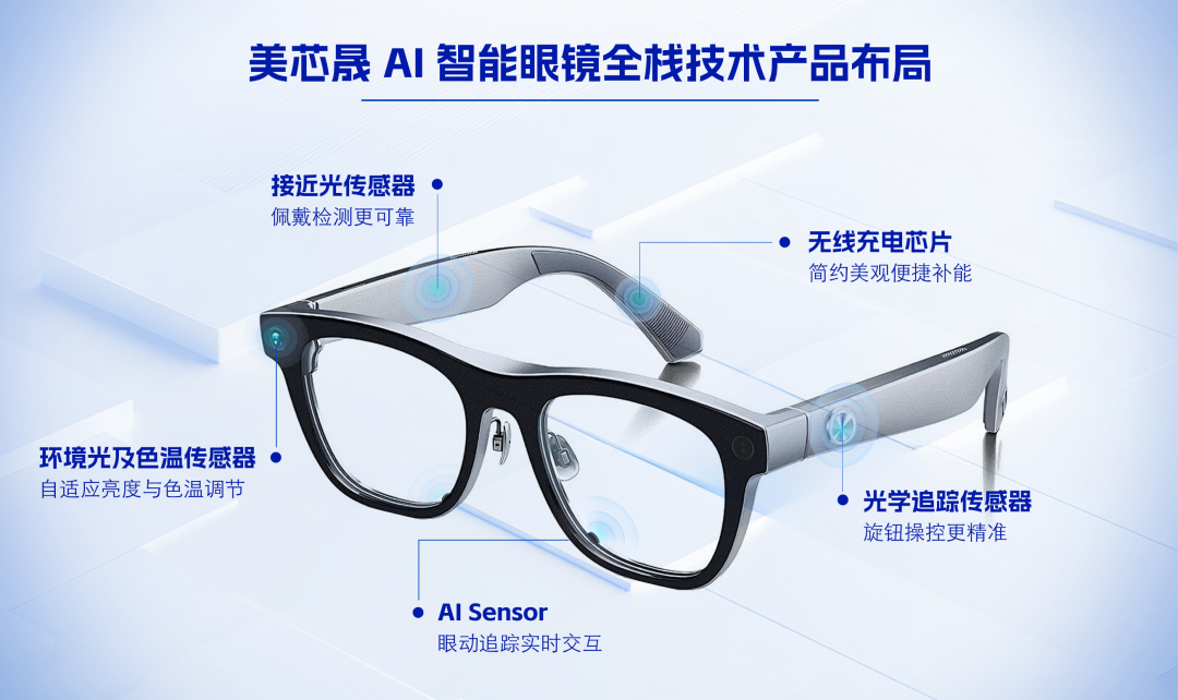 全球 AI 智能眼鏡、VR/MR 頭顯市場(chǎng)出貨量持續(xù)激增,Meta、蘋果、華為、三星等國內(nèi)外科技品牌紛紛加碼。隨著設(shè)備向輕量化、長續(xù)航、多模態(tài)交互方向演進(jìn),行業(yè)對(duì)芯片的高集成度、小尺寸封裝及高精度感知能力提出了嚴(yán)苛要求。美芯晟多款智能感知傳感器芯片和電源管理芯片,為 AI 智能眼鏡提供光學(xué)旋鈕、佩戴檢測(cè)、環(huán)境光檢測(cè)、眼動(dòng)追蹤、無線充電等核心解決方案。