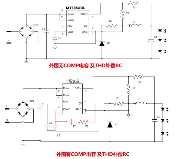 MT7855BL日光燈方案管腳兼容業內同類產品,客戶替代不需要更換PCB,直接去掉COMP電容及補償的RC即可。